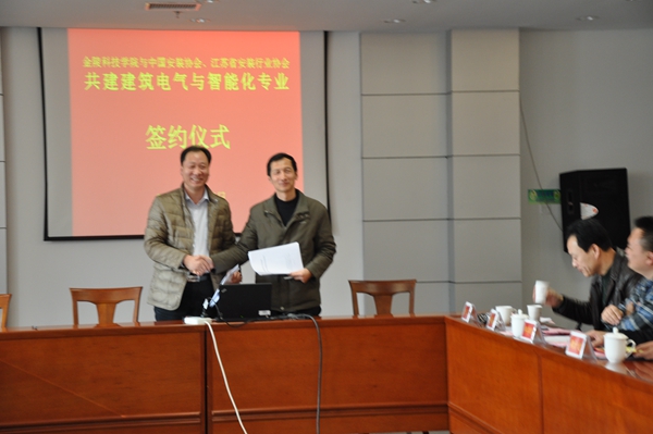 2014年3月14日,金陵科技学院与中国安装协会智能化与消防工程分会、江苏省安装行业协会智能消防电子专业委员会签订了共建“建筑电气与智能化专业”的协议。出席协议签订仪式的有金陵科技学院副校长冯年华、金陵科技学院教务处副处长吴钟鸣、金陵科技学院机电工程学院院长鞠全勇、党总支书记赵士安、副院长周扩建、郑李明、副书记陈建、楼宇系主任牟福元等领导和老师。江苏省安装行业协会会长邹金林;中国安装协会智能化与消防工程分会会长、江苏省行业协会智能消防电子分会会长、江苏多多28科技集团有限公司总经理陈晓;分会秘书长助理余晶等出席了会议。